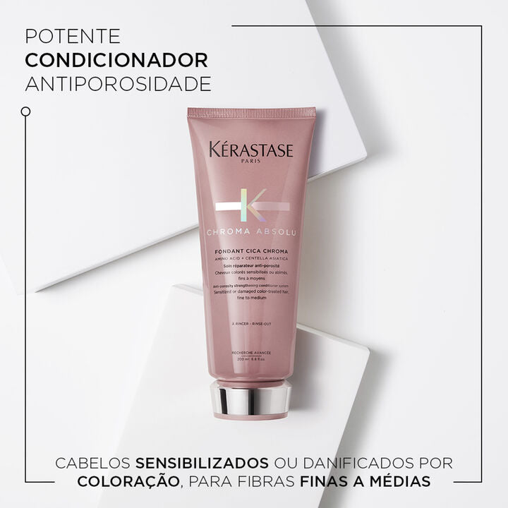O Fondant Cica Chroma é um condicionador para cabelos coloridos adaptado para fios finos a médios. Seu efeito anti-porosidade é o segredo para manter a cor preservada e cabelos brilhantes. Este condicionador foi especialmente formulado com Aminoácidos e Centelha Asiática, sendo capaz de penetrar profundamente no núcleo da fibra e deixar os fios 86% mais fortes*, reduzindo a porosidade da fibra para uma cor mais brilhante e duradoura. Esta fórmula avançada ajuda a proteger o cabelo das propriedades de remoção de água dura durante o banho*. O cabelo fica mais saudável e até 92% da intensidade da cor é preservada após 6 semanas**.