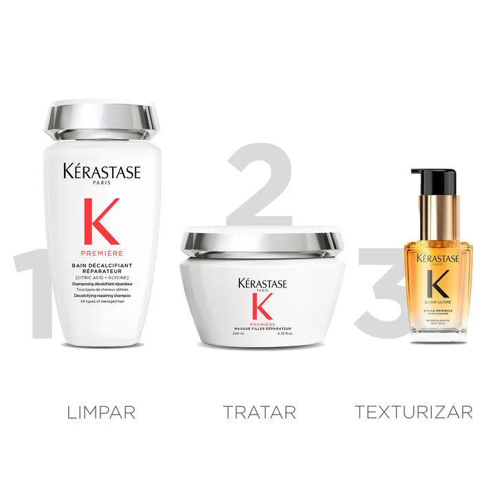 Tratamento que une o poder do Shampoo Kérastase Première Bain Décalcifiant Réparateur, ideal para todos os tipos de cabelos danificados, à Máscara Première Filler Réparateur, antiquebra e reparadora. Sua fórmula ultra-delicada, enriquecida com ativos poderosos, elimina a sobrecarga de cálcio, remove as impurezas e repara profundamente a fibra capilar , reduzindo drasticamente a quebra dos fios. Cabelos mais fortes, macios, brilhantes e com movimento natural.