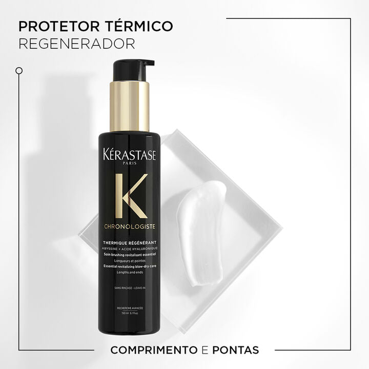 O Kérastase Chronologiste Thermique Régénérant é um protetor térmico regenerador com textura de leave-in refinado e suave. A solução completa para aprimorar a textura do cabelo e protegê-lo contra quebras. Esta fórmula avançada não só suaviza as cutículas para um cabelo mais macio, como também fortalece a fibra capilar, ajudando a evitar quebras. Além disso, o protetor térmico Kérastase Chronologiste Thermique Régénérant oferece proteção contra o calor, até 230°C, para garantir que os fios permaneçam saudáveis e resistentes ao calor causado por ferramentas de calor. E o melhor de tudo, proporciona um controle de frizz duradouro, mesmo em condições de 80% de umidade*, deixando o cabelo com uma aparência impecável o dia todo.