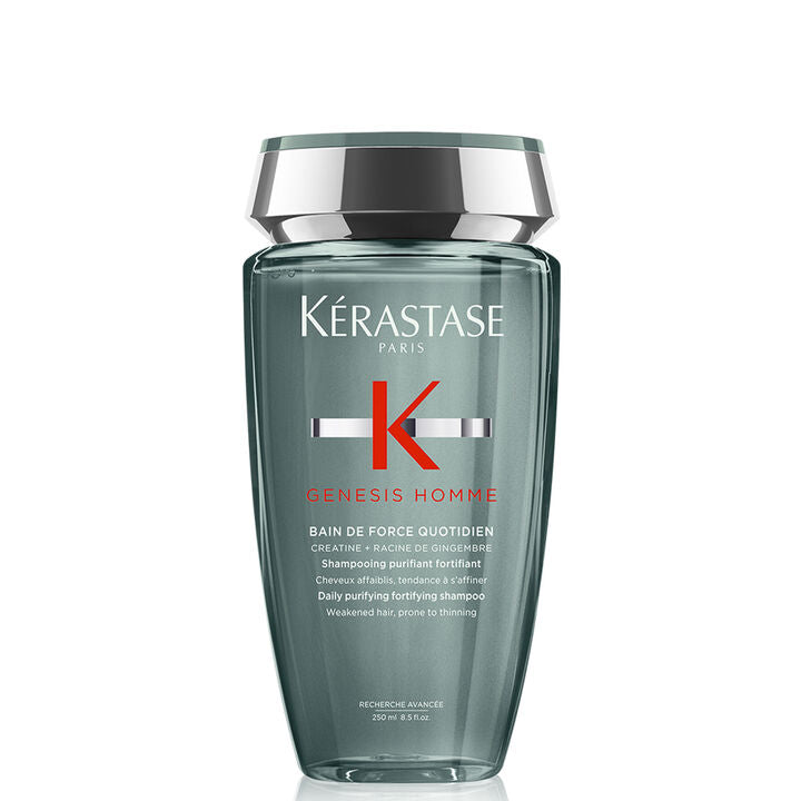 Bain de Force Quotidien é um shampoo antiqueda masculino fortificante de limpeza profunda para cabelos enfraquecidos com tendência a afinamento. Sua espuma espessa remove as impurezas e sujeira do couro cabeludo, enquanto fortalece o cabelo enfraquecido e com tendência a queda. Enriquecido com Creatina e Raiz de Gengibre, este shampoo fortalece as fibras capilares e dá uma sensação refrescante. Mais de 80% dos consumidores dizem que sentem seu couro cabeludo revigorado, equilibrado e energizado. Fórmula livre de parabeno e silicone.
